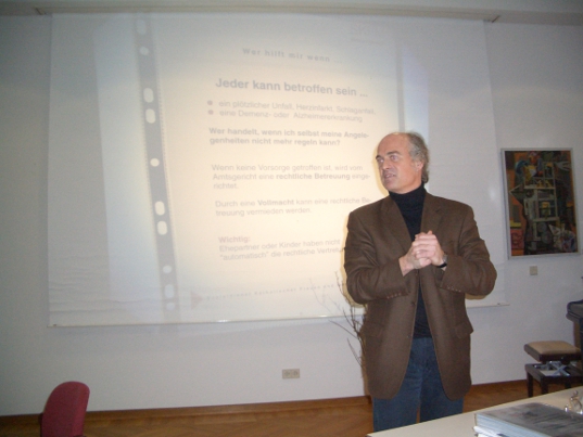 Michael Falk, Geschäftsführer des Sozialdienstes katholischer Frauen und Männer (SKFM-Landau) trug sein Thema entlang der Broschüre des Justizministeriums von RLP "Wer hilft mir wenn . . ." (Vorsorgevollmacht, Betreuungsverfügung und Patientenverfügung) mit großem Engagement vor.